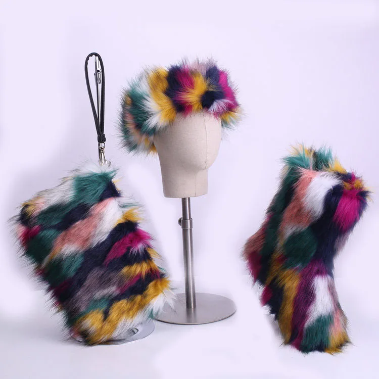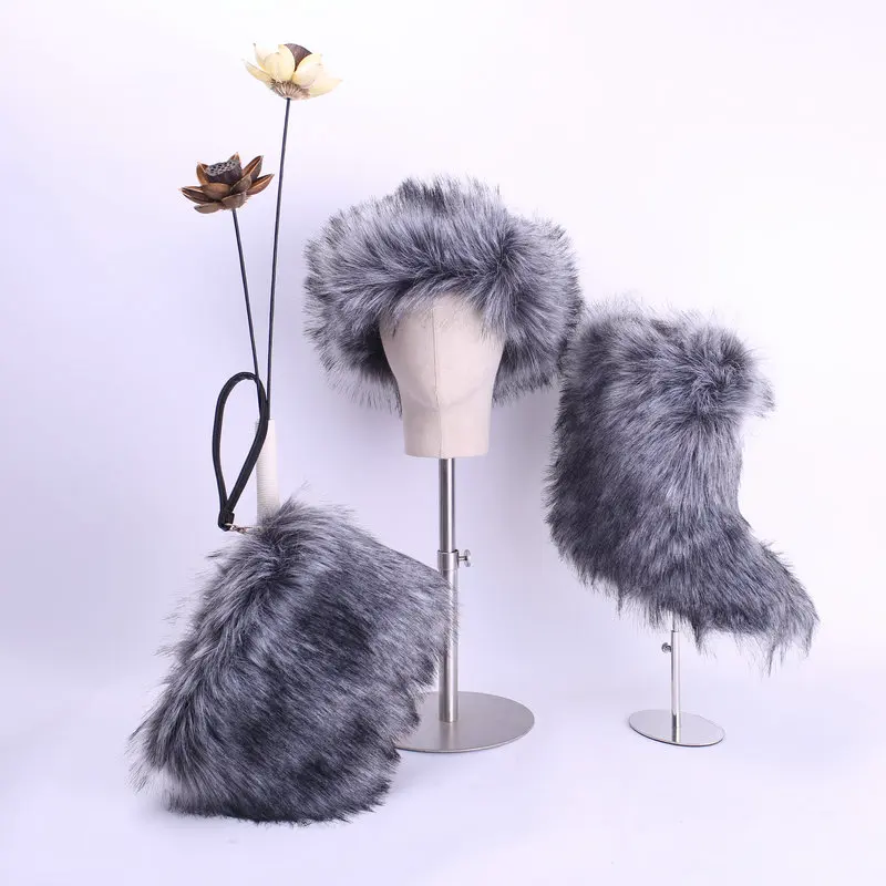 Women's Winter Snow 3 Piece Fur Sets with Boots, Headband, and Bag