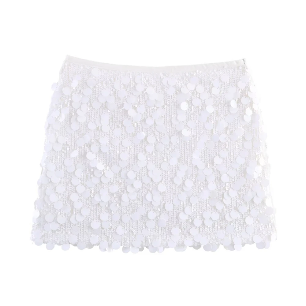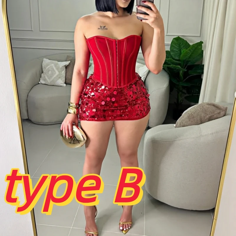 • Two-piece set: Corset-style vest + sequin mini skirt